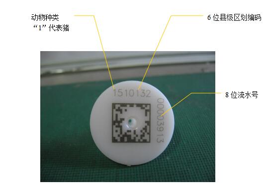 二維碼動(dòng)物標(biāo)識(shí)由二維碼和編碼兩個(gè)部分組成。二維碼采用加密技術(shù)的行業(yè)專用碼,具有防偽功能;編碼由動(dòng)物種類+區(qū)劃編碼+標(biāo)識(shí)順序號(hào)組成。如下圖所示(以豬耳標(biāo)為例):